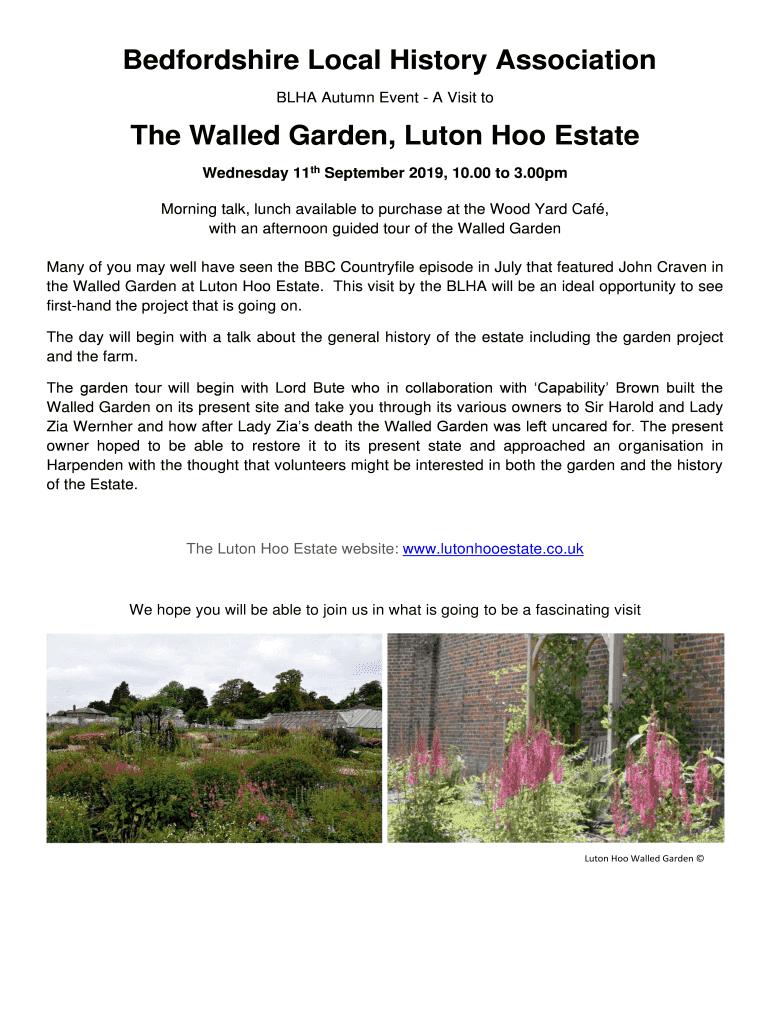 Bedfordshire Local History Association BHA Autumn Event A Visit tithe Walled Garden, Luzon Hui Estate Wednesday 11th September 2019, 10.00 to 3.00pm Morning talk, lunch available to purchase at the