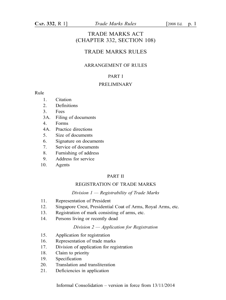 CAP. 332, R 1 trademarks Rules 2008 Ed. p. 1TRADE MARKS ACT (CHAPTER 332, SECTION 108) trademarks RULES ARRANGEMENT OF RULES PART I PRELIMINARily Rule 1. 2. 3. 3A. 4. 4A. 5. 6. 7. 8. 9. 10. Citation