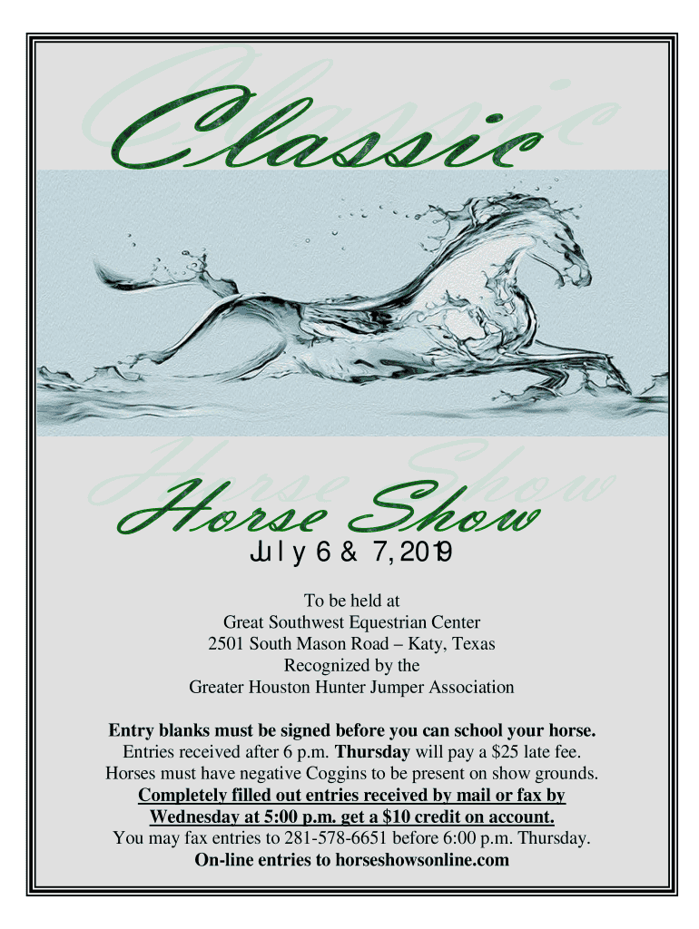 July 6 & 7, 2019 To be held at Great Southwest Equestrian Center 2501 South Mason Road Katy, Texas Recognized by the Greater Houston Hunter Jumper Association Entry blanks must be signed before you