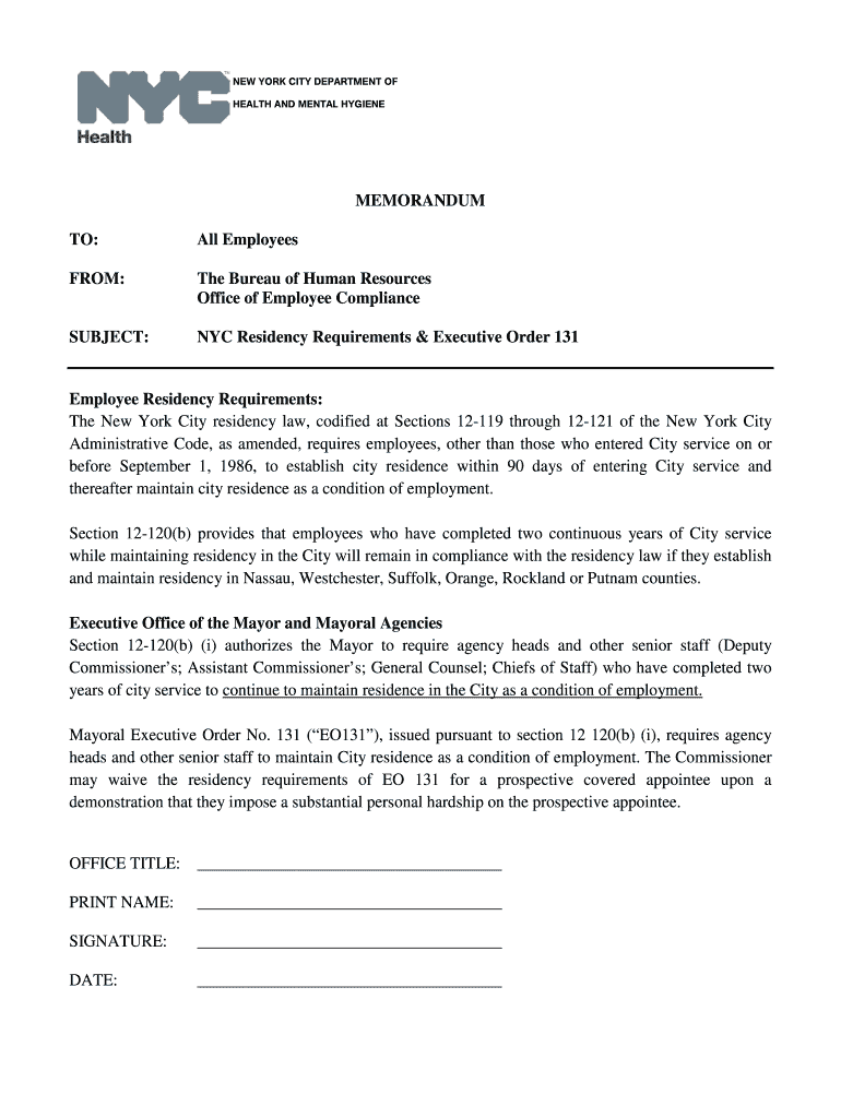 NEW YORK CITY DEPARTMENT OF HEALTH AND MENTAL HYGIENEMEMORANDUM TO:All EmployeesFROM:The Bureau of Human Resources Office of Employee ComplianceSUBJECT:NYC Residency Requirements & Executive Order