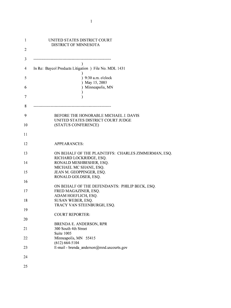 11UNITED STATES DISTRICT COURT DISTRICT OF MINNESOTA2 37) In Re: Products Litigation) File No. MDL 1431)) 9:30 a.m. o\'clock) May 15, 2003) Minneapolis, MN))84 5 69 10BEFORE THE HONORABLE MICHAEL