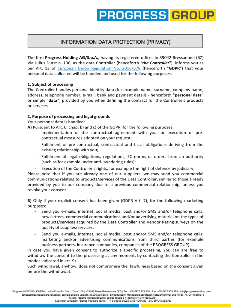 INFORMATION DATA PROTECTION (PRIVACY) The firm Progress Holding AG/S.p.A., having its registered offices in 39042 Breastbone (BY) Via Julius Durst n. 100, as the data Controller (henceforth “the