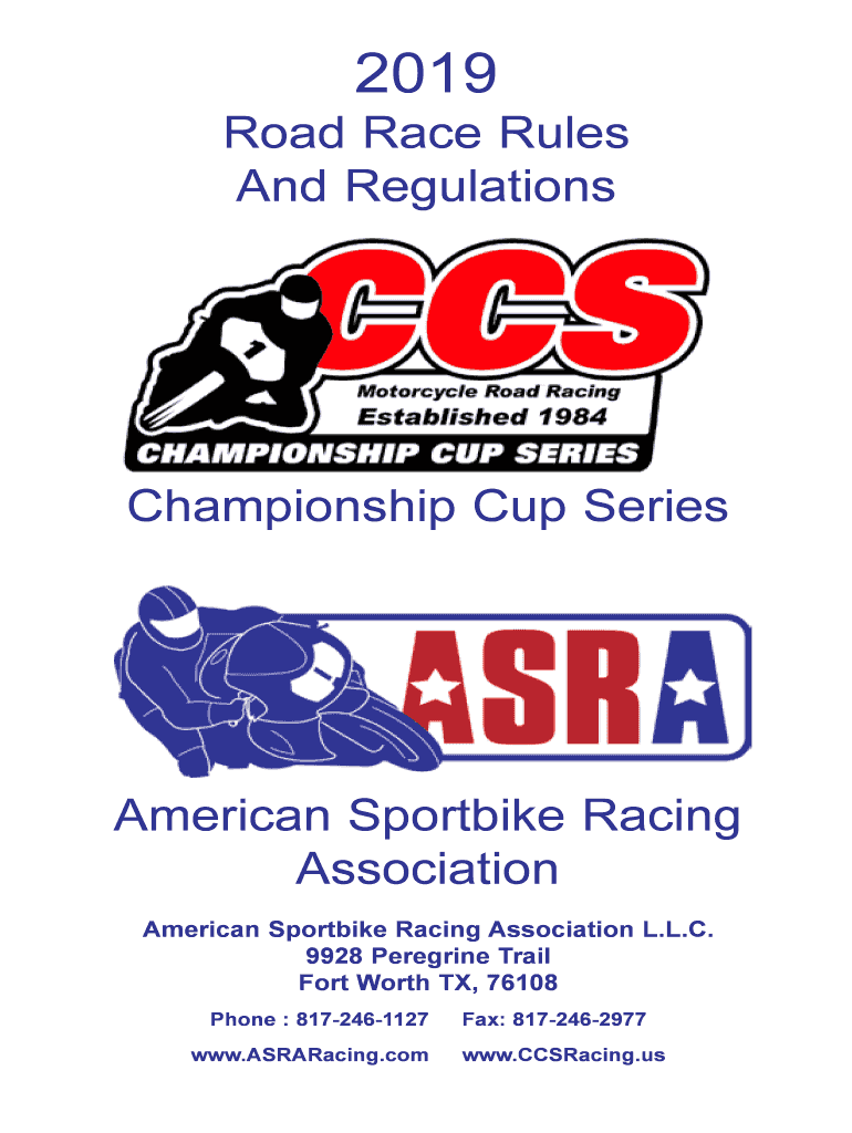 2019Road Race Rules And RegulationsChampionship Cup Series American Sport bike Racing Association American Sport bike Racing Association L.L.C. 9928 Peregrine Trail Fort Worth TX, 76108 Phones : 8172461127