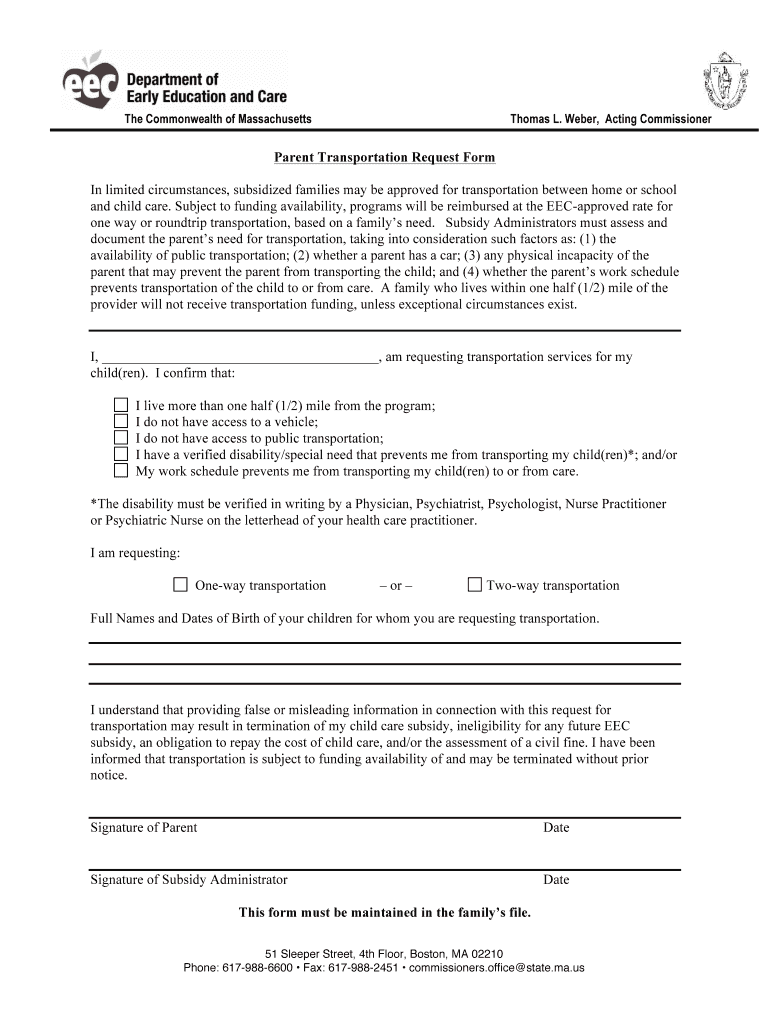 The Commonwealth of Massachusetts Thomas L. Weber, Acting CommissionerParent Transportation Request Form
