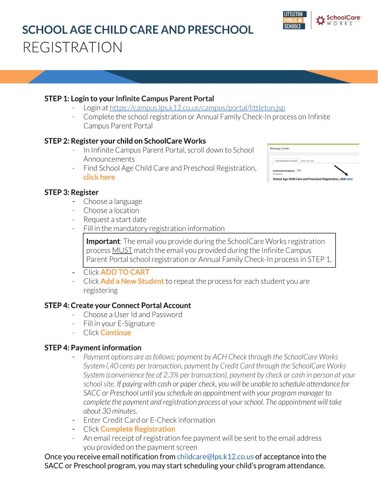 SCHOOL AGE CHILD CARE AND PRESCHOOLREGISTRATION STEP 1: Login to your Infinite Campus Parent Portal Login at https://campus.lps.k12.co.us/campus/portal/littleton.jsp Complete the school registration