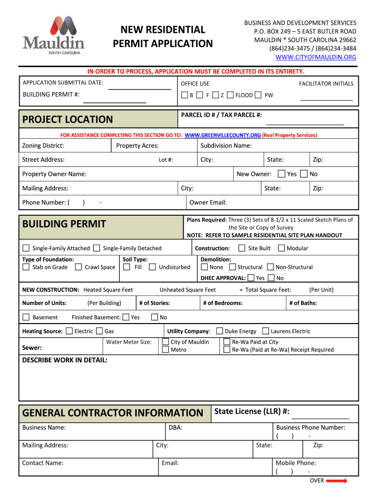 BUSINESS AND DEVELOPMENT SERVICES P.O. BOX 249 5 EAST BUTLER ROAD MAULDIN * SOUTH CAROLINA 29662 (864)2343475 / (864)2343484 WWW.CITYOFMAULDIN.RENEW RESIDENTIAL PERMIT APPLICATION IN ORDER TO PROCESS,