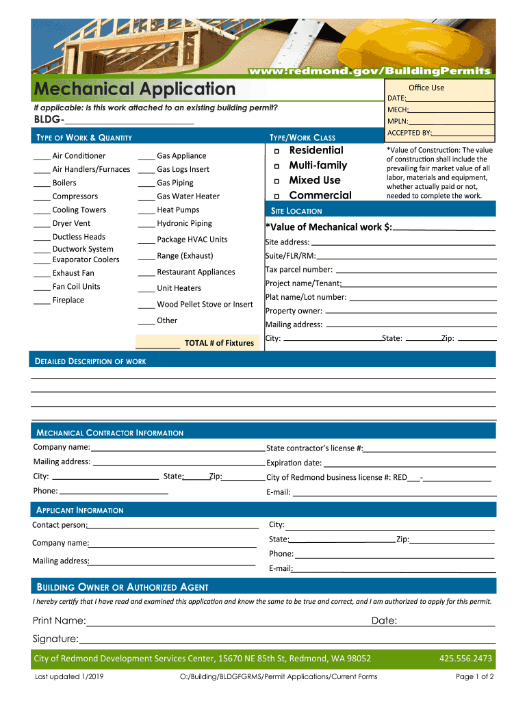 Mechanical ApplicationOffice Use DATE: MUCH: MPL: ACCEPTED BY:If applicable: Is this work attached to an existing building permit?BLDG TYPE OF WORK & QUANTITY Air ConditionerTYPE/WORK CLASS Residential