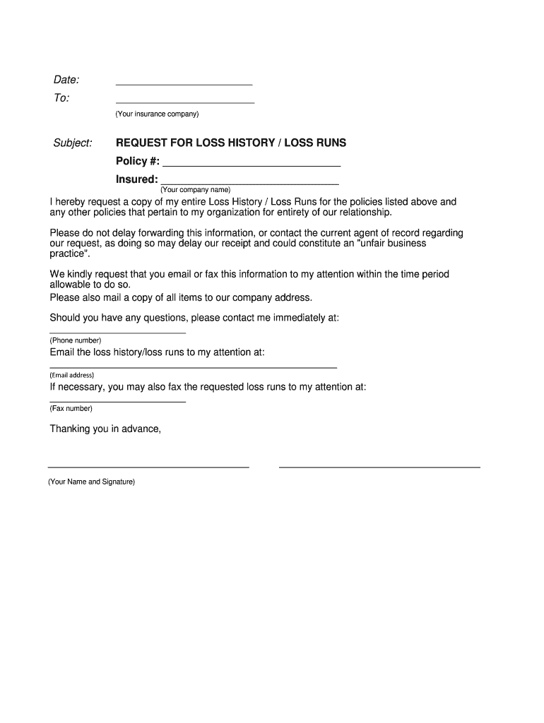 Date: To: (Your insurance company)Subject:REQUEST FOR LOSS HISTORY / LOSS RUNS Policy #: Insured: (Your company name)I hereby request a copy of my entire Loss History / Loss Runs for the policies