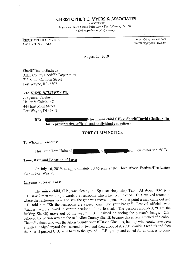 CHRISTOPHER C. MYERS & ASSOCIATES LAW OFFICES809 S. Calhoun Street Suite 400 Fort Wayne, IN 46802(260) 4240600 (260) 4240712cmyers oversaw. Christopher C. MYERScseiTano oversaw. Company T. SERRANOAugust