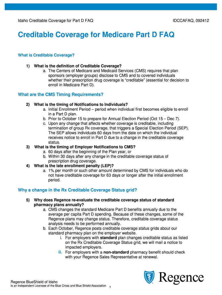 Idaho Creditable Coverage for Part D FAQIDCCAFAQ, 092412Creditable Coverage for Medicare Part D FAQ