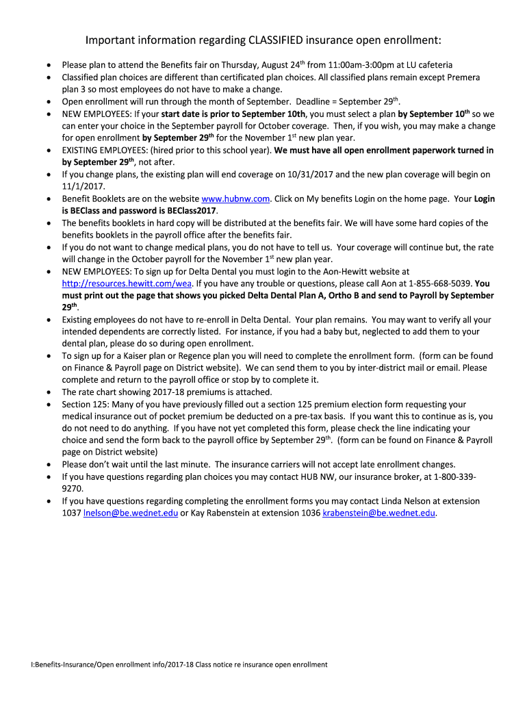 Important information regarding CLASSIFIED insurance open enrollment: Please plan to attend the Benefits fair on Thursday, August 24th from 11:00am3:00pm at LU cafeteria Classified plan choices are