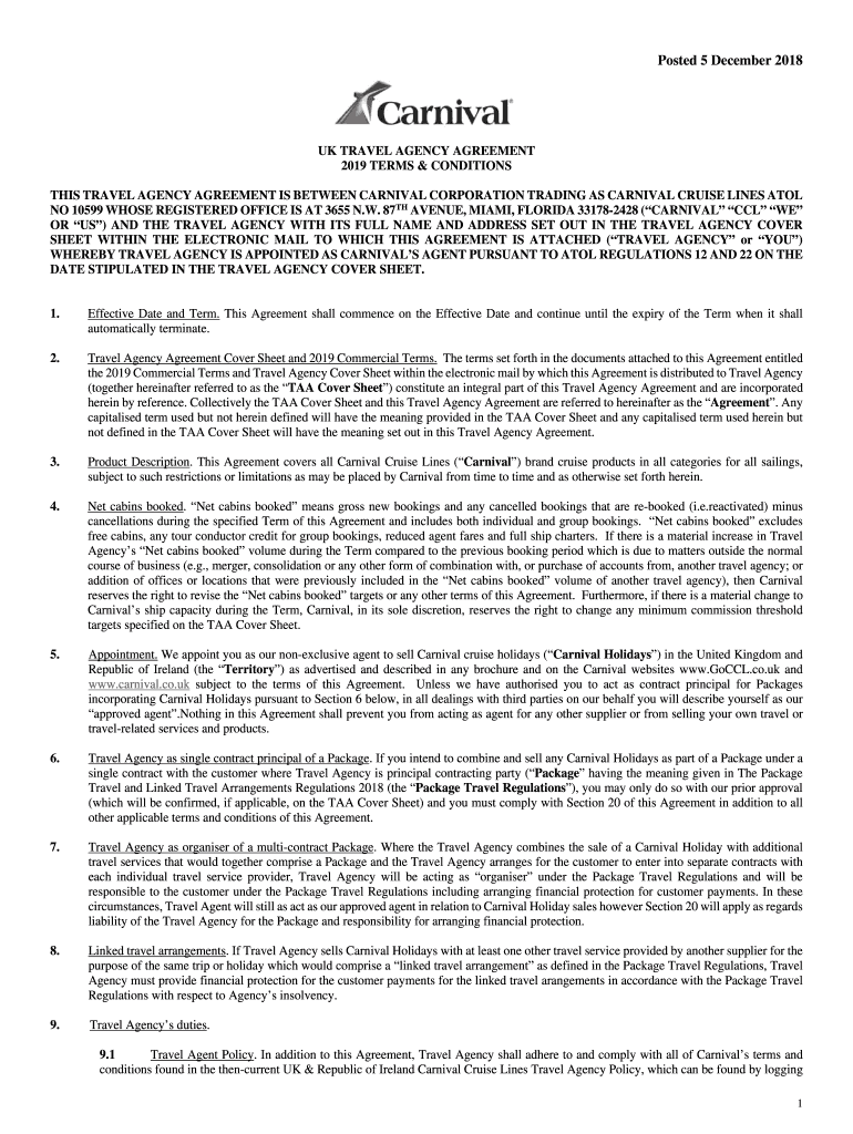 Posted 5 December 2018UK TRAVEL AGENCY AGREEMENT 2019 TERMS & CONDITIONS THIS TRAVEL AGENCY AGREEMENT IS BETWEEN CARNIVAL CORPORATION TRADING AS CARNIVAL CRUISE LINES ATOM NO 10599 WHOSE REGISTERED