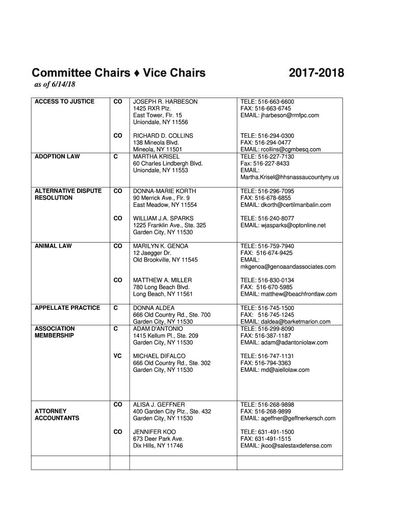 Committee Chairs Vice Chairs20172018as of 6/14/18 ACCESS TO JUSTICECOJOSEPH R. HARRISON 1425 RR Please. East Tower, FLR. 15 Uniondale, NY 11556TELE: 5166636600 FAX: 5166636745 EMAIL: Harrison RPC.comCORICHARD