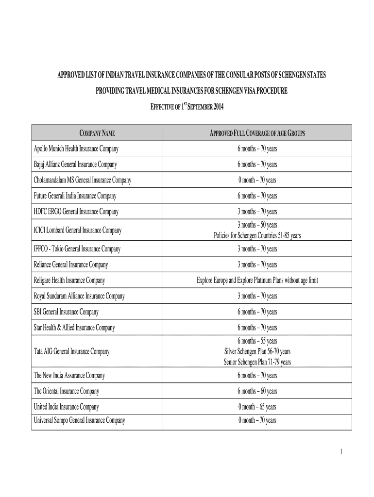 APPROVED LIST OF INDIAN TRAVEL INSURANCE COMPANIES OF THE CONSULAR POSTS OF SCHENGEN STATES PROVIDING TRAVEL MEDICAL INSURANCES FOR SCHENGEN VISA PROCEDURE EFFECTIVE OF 1ST SEPTEMBER 2014 COMPANY