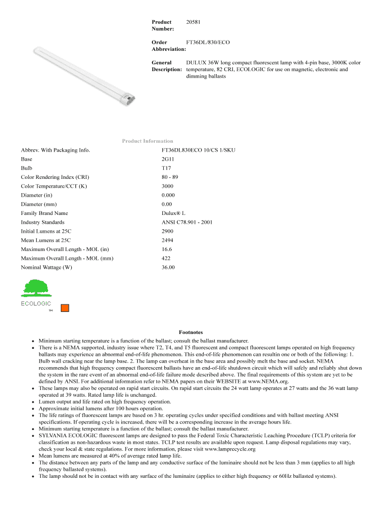 Product Number:20581Order FT36DL/830/ECO Abbreviation: General DULL 36W long compact fluorescent lamp with 4pin base, 3000K color Description: temperature, 82 CRY, ECOLOGIC for use on magnetic, electronic