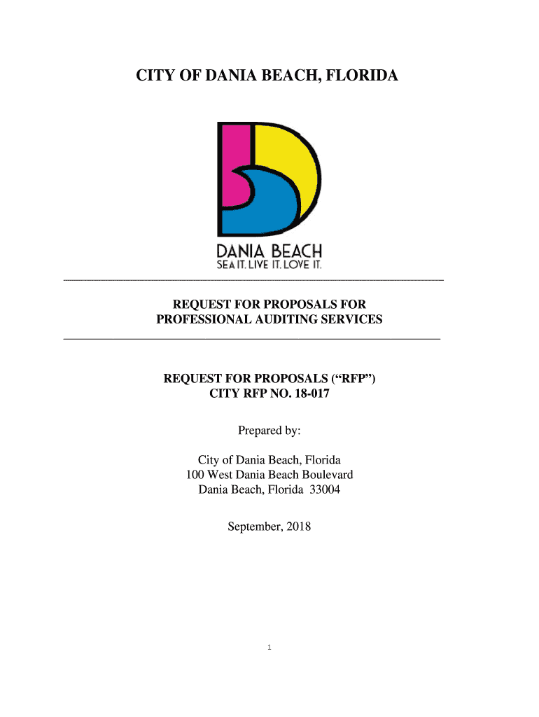 CITY OF DANIA BEACH, FLORIDA REQUEST FOR PROPOSALS FOR PROFESSIONAL AUDITING SERVICES REQUEST FOR PROPOSALS (RFP) CITY RFP NO. 18017 Prepared by: City of Dania Beach, Florida 100 West Dania Beach