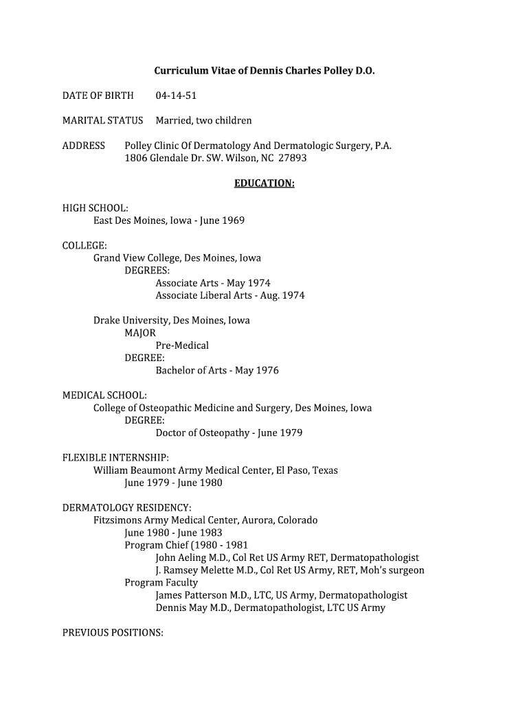 CurriculumVitaeofDennisCharlesPolleyD. O. 041451DATEOFBIRTH MARITALSTATUS Married, two children ADDRESS PolleyClinicOfDermatologyAndDermatologicSurgery, P.A. 1806GlendaleDr.SW. Wilson,NC27893 EDUCATION: