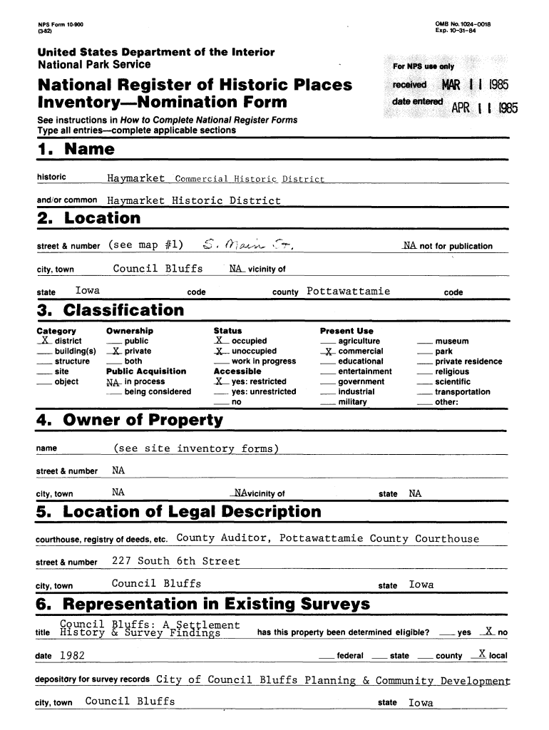 OMB No. 10240018 Exp.103184NFS Form 10900 (382)United States Department of the International Park ServiceNow NFS use National Register of Historic Places InventoryNomination Form received MAR 11 I985