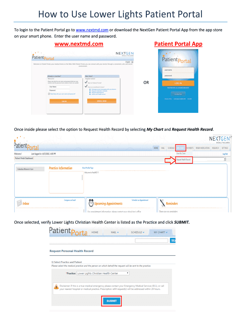 To login to the Patient Portal go to www.nextmd.com or download the Next Gen Patient Portal App from the app store