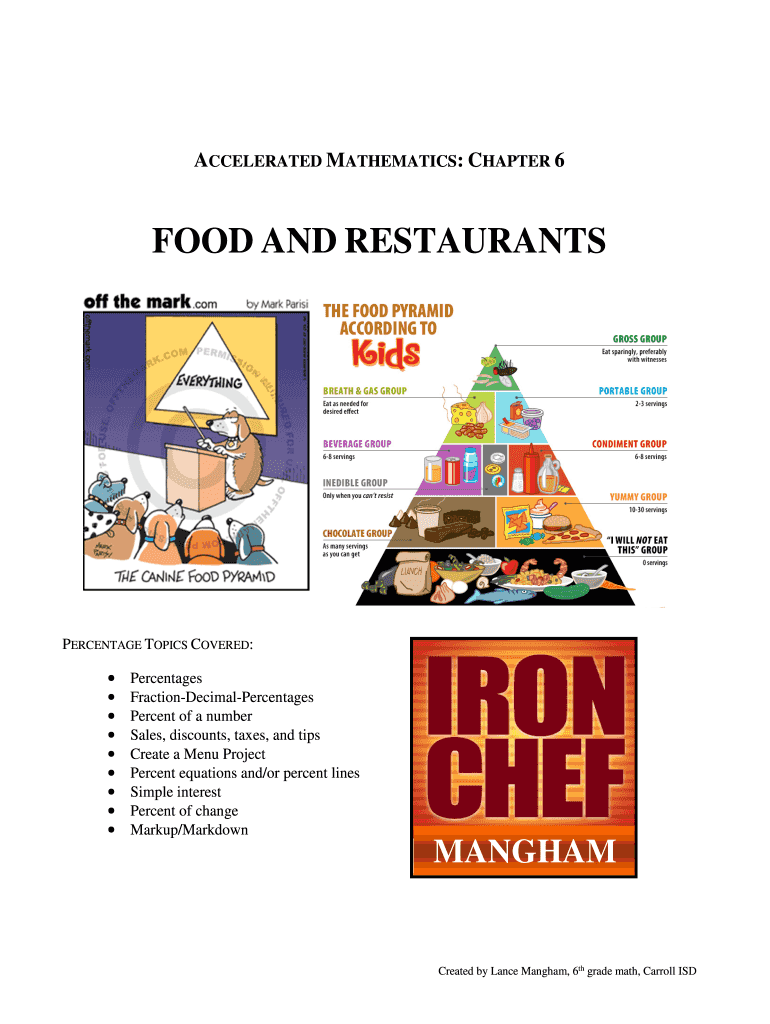 ACCELERATED MATHEMATICS: CHAPTER 6FOOD AND RESTAURANTSPERCENTAGE TOPICS COVERED: Percentages FractionDecimalPercentages Percent of a number of Sales, discounts, taxes, and tips Create a Menu Project