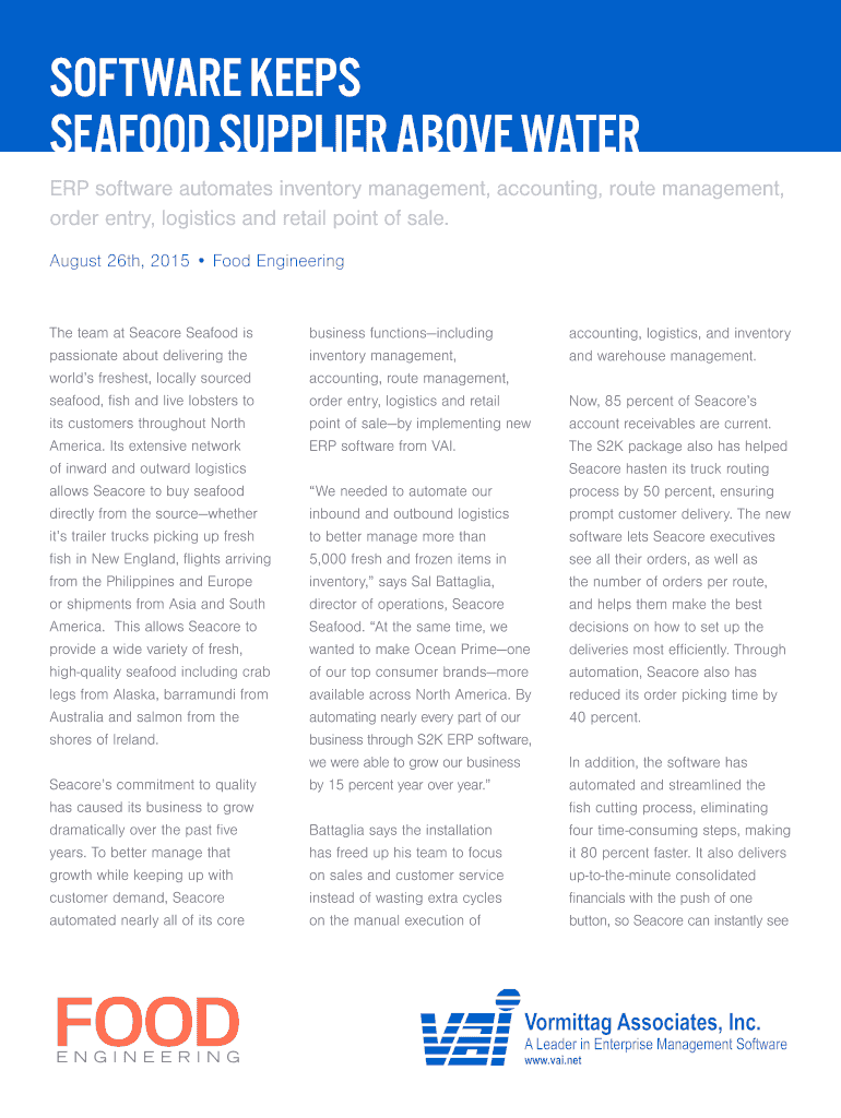 SOFTWARE KEEPS SEAFOOD SUPPLIER ABOVE WATER ERP software automates inventory management, accounting, route management, order entry, logistics and retail point of sale. August 26th, 2015 Food Engineering