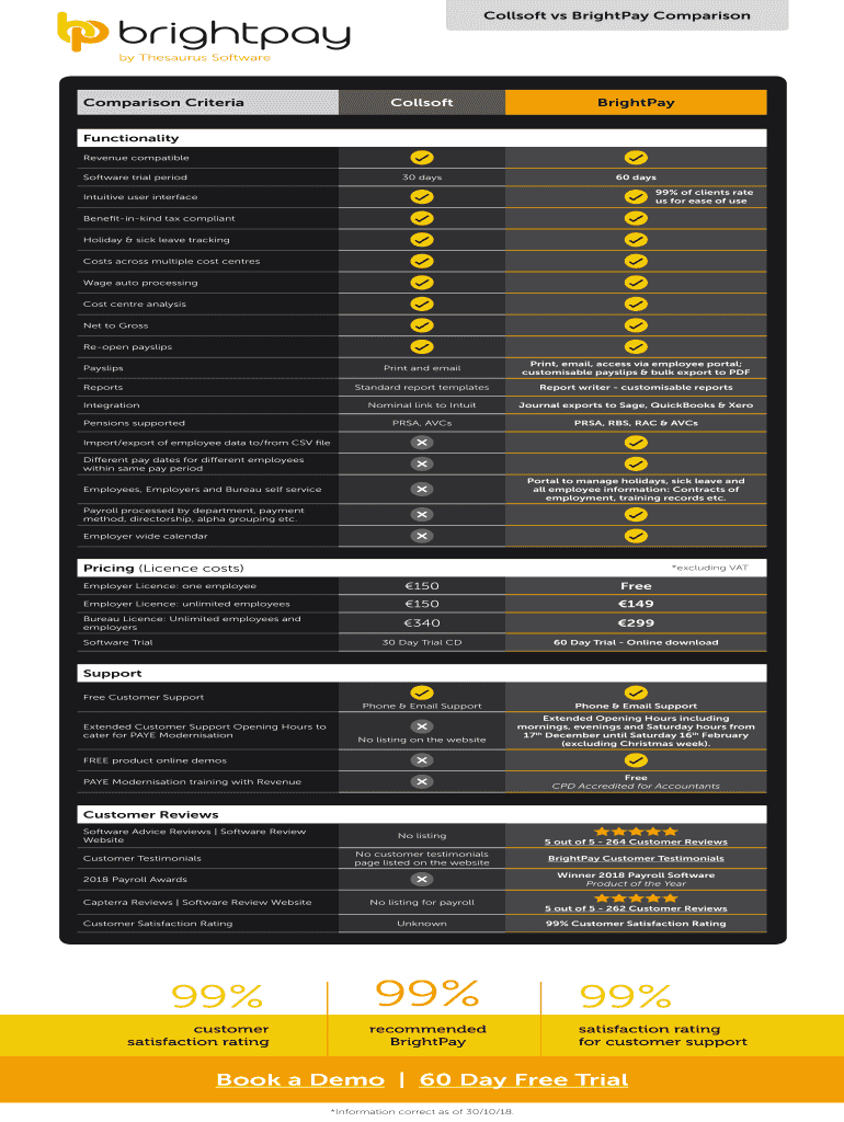 Coll soft vs Brightly Comparison by Thesaurus SoftwareComparison CriteriaCollsoftBrightPay30 days60 dysfunctionality Revenue compatible Software trial period99% of clients rate us for ease of unintuitive