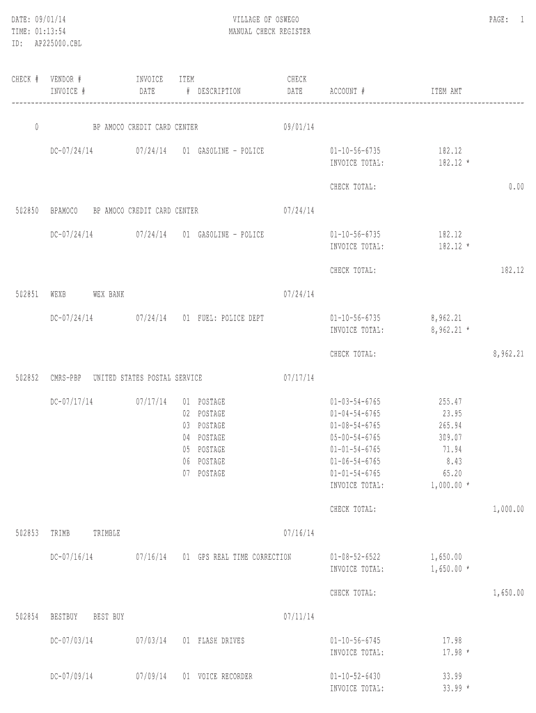 DATE: 09/01/14 TIME: 01:13:54 ID: AP225000.VILLAGE OF OSWEGO MANUAL CHECK REGISTERING :1CHECK #VENDOR # INVOICE ITEM CHECK INVOICE # DATE # DESCRIPTION DATE ACCOUNT # ITEM AMT 0BP AMOCO CREDIT CARD