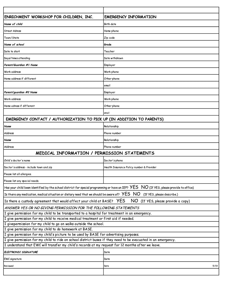 ENRICHMENT WORKSHOP FOR CHILDREN, INC.EMERGENCY Informational of childbirth backstreet AdressHome hometown/State code-name of schoolGradeDate to startTeacherDays/times attendingDate withdrawnParent/Guardian
