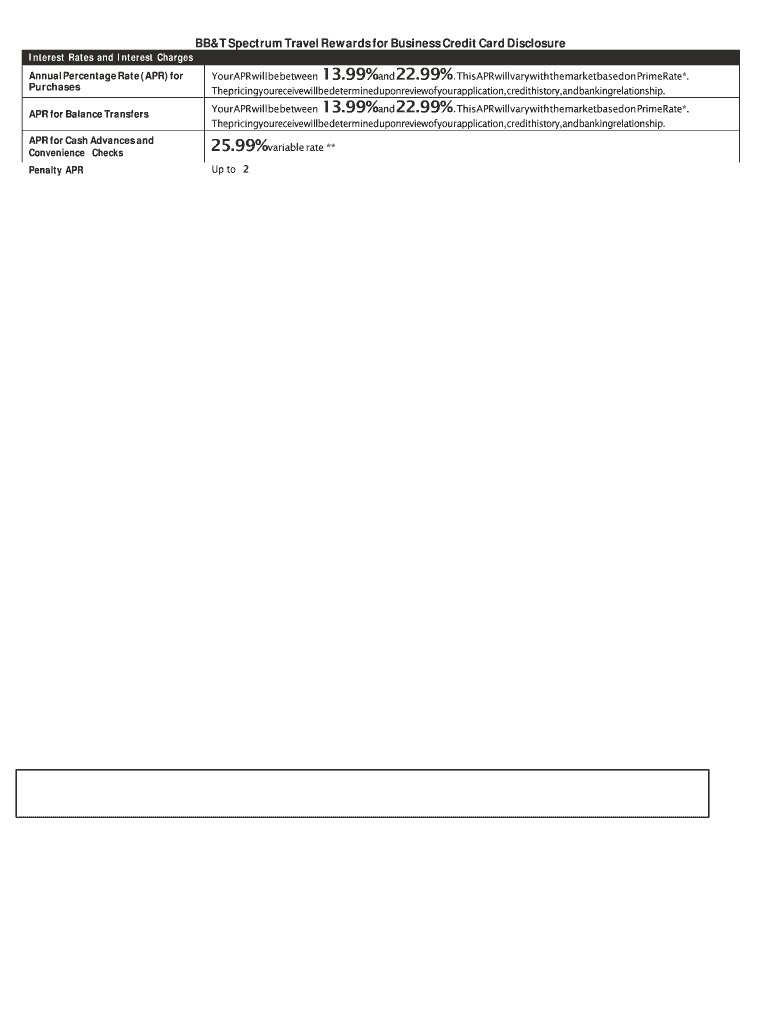 BBT Spectrum Travel Rewards for Business Credit Card Disclosure Interest Rates and Interest Charges13.99× 22.99×Annual Percentage Rate (APR) for PurchasesYourAPRwillbebetween and. ThisAPRwillvarywiththemarketbasedon