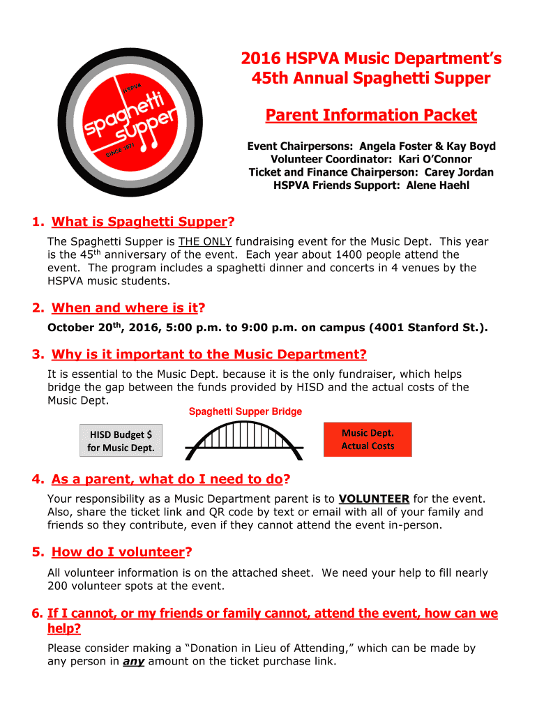 2016 HS PVA Music Departments 45th Annual Spaghetti Supper Parent Information Packet Event Chairpersons: Angela Foster & Kay Boyd Volunteer Coordinator: Kari O'Connor Ticket and Finance Chairperson: