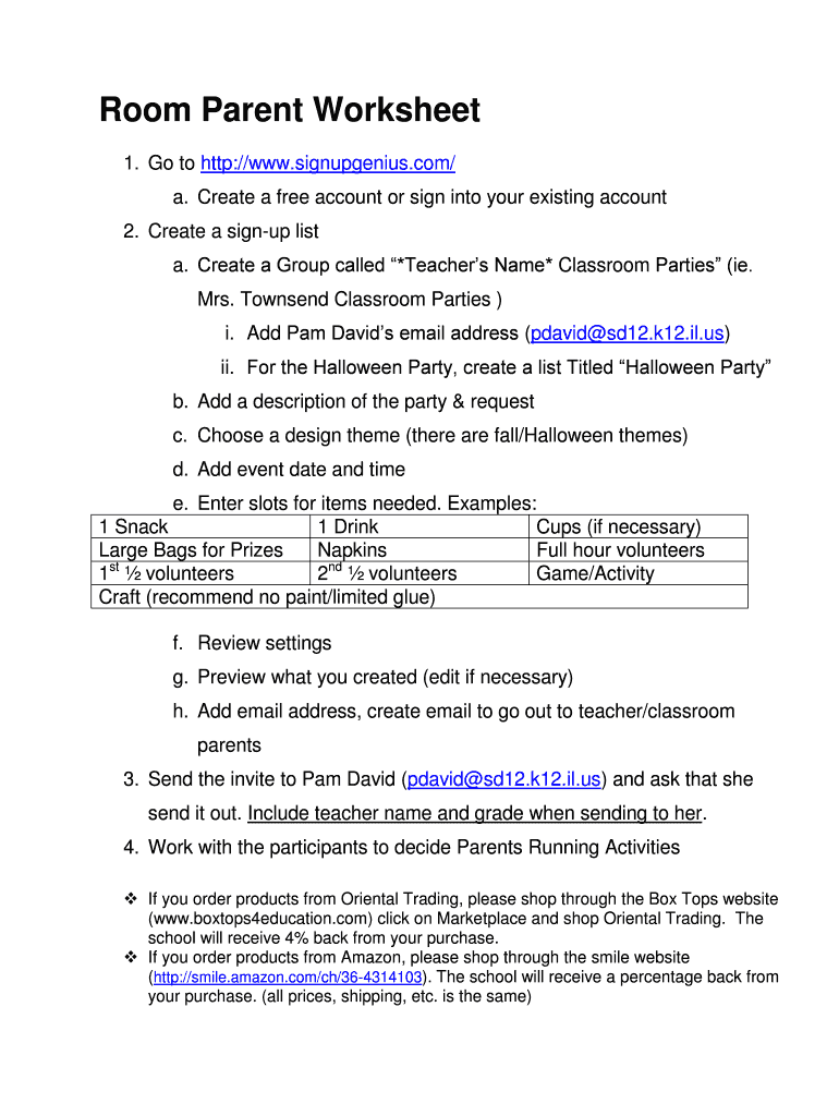 Room Parent Worksheet 1. Go to http://www.signupgenius.com/ a. Create a free account or sign into your existing account 2. Create a sign-up list a. Create a Group called *Teachers Name* Classroom