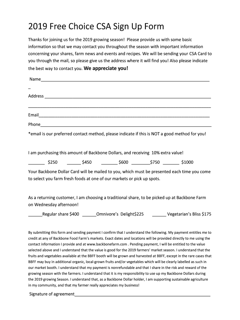 2019 Free Choice CSA Sign Up Form Thanks for joining us for the 2019 growing season! Please provide us with some basic information so that we may contact you throughout the season with important information