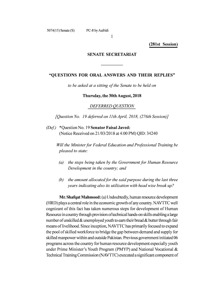 5074(15) Senate (S)PC8 by Aafridi1 (281st Session) SENATE SECRETARIAT QUESTIONS FOR ORAL ANSWERS AND THEIR REPLIES to be asked at a sitting of the Senate to be held on Thursday, the 30th August 2018