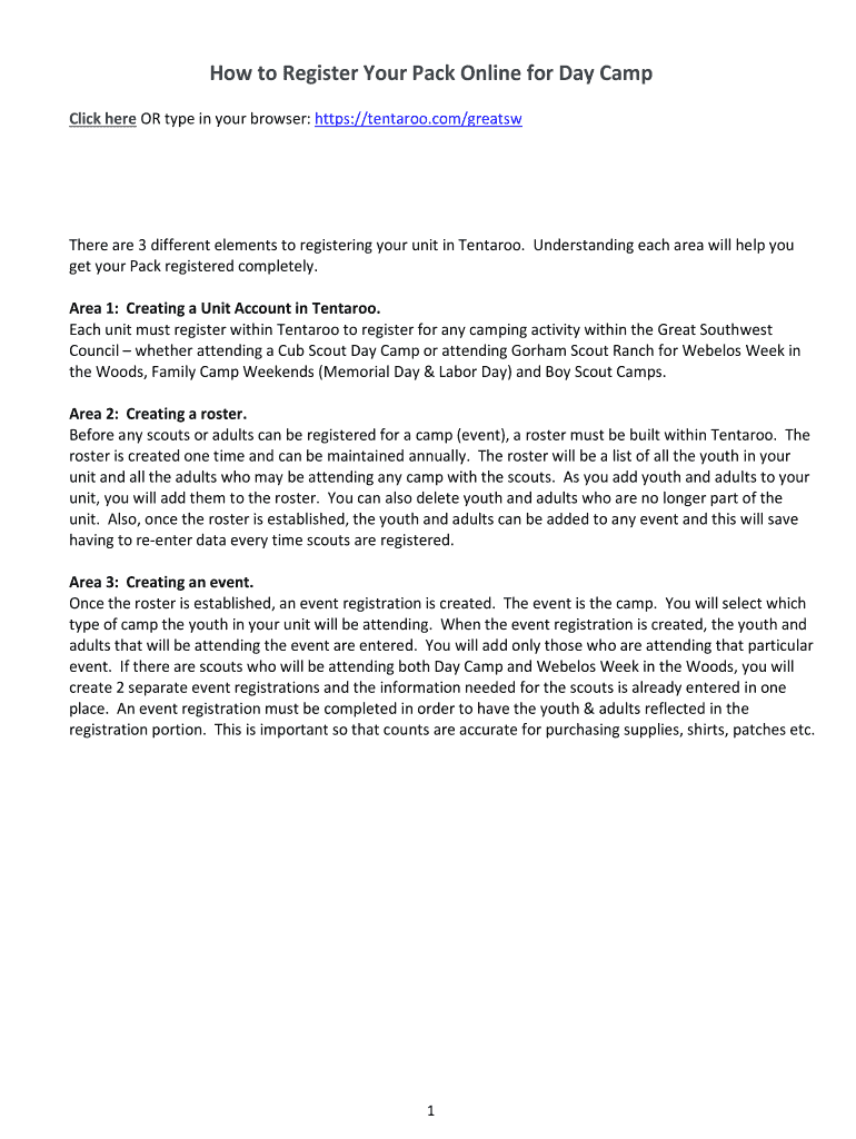 How to Register Your Pack Online for Day Camp Click here OR type in your browser: https://tentaroo.com/greatswThere are 3 different elements to registering your unit in Centuries. Understanding each