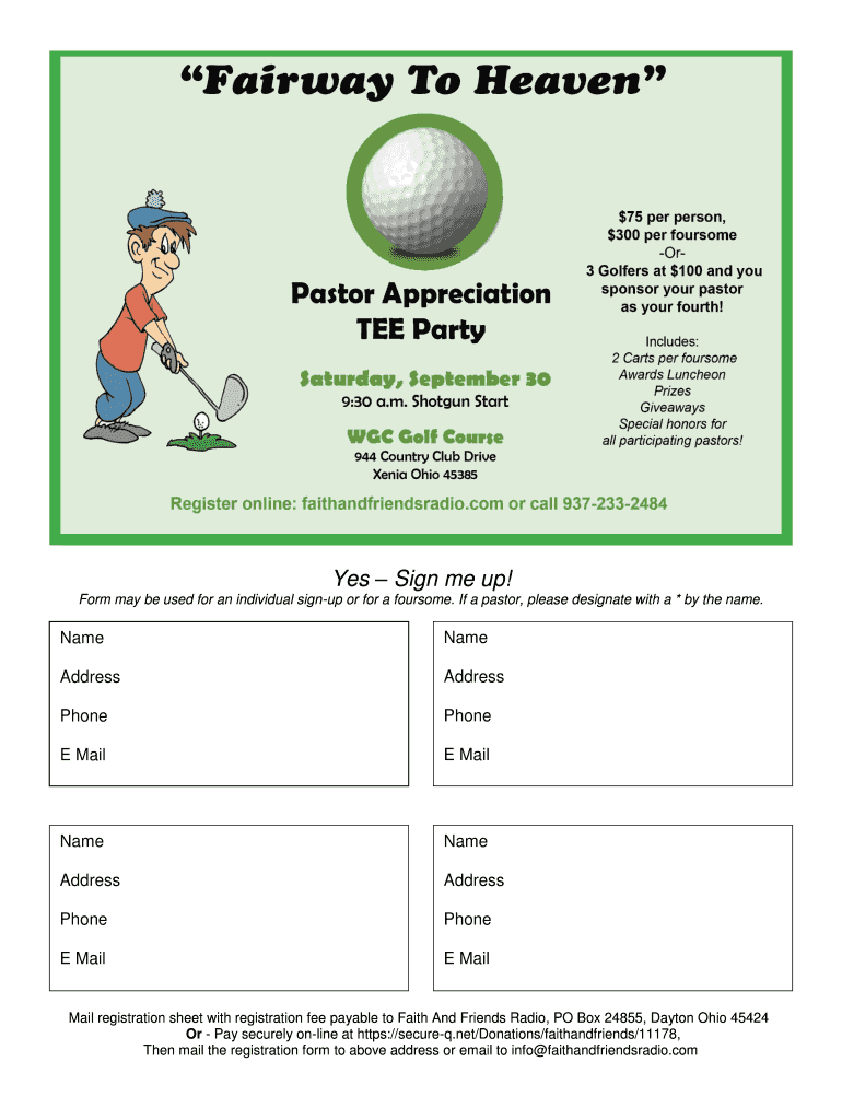 Yes Sign me up! Form may be used for an individual sign up or for a foursome. If a pastor, please designate with a * by the name. Name Address Phone E Misname Name Address Phone E Mail E Misname Name