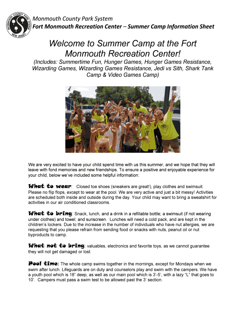 Monmouth County Park System Fort Monmouth Recreation Center Summer Camp Information SheetWelcome to Summer Camp at the Fort Monmouth Recreation Center!(Includes: Summer Fun, Hunger Games, Hunger Games