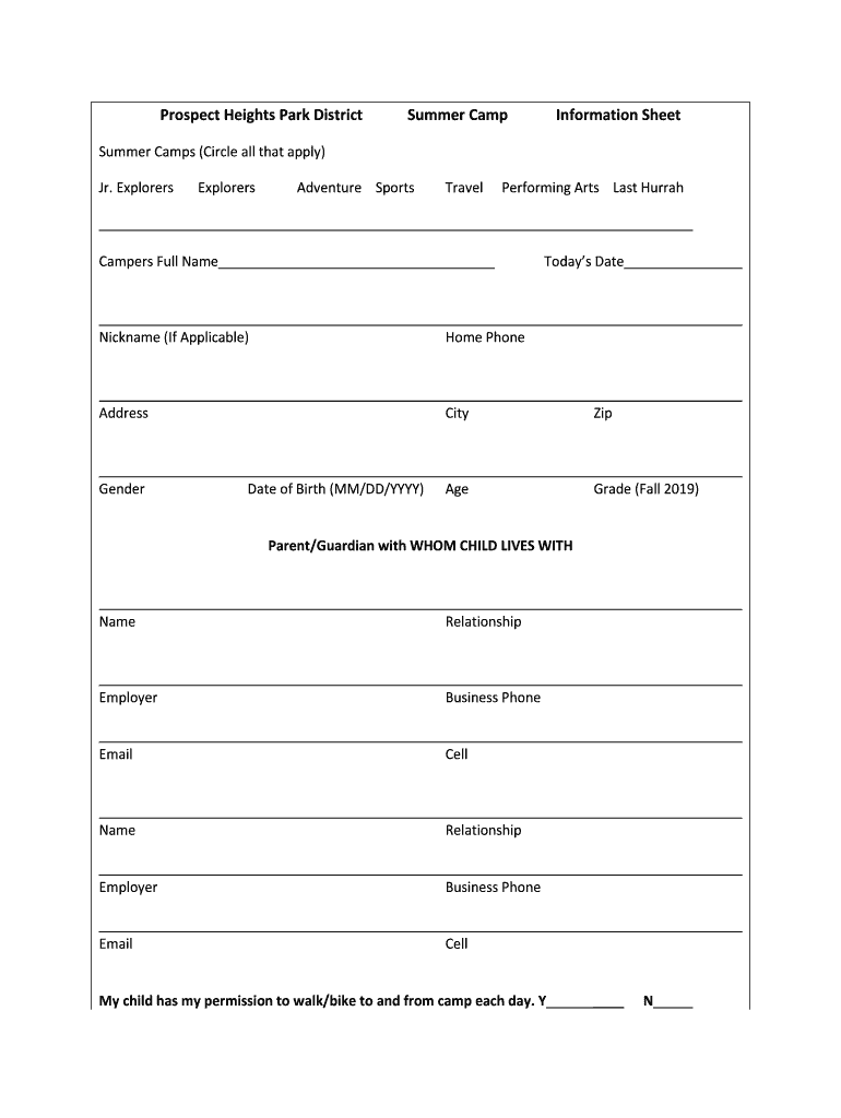 Prospect Heights Park District Summer CampInformation Sheet Summer Camps (Circle all that apply)
