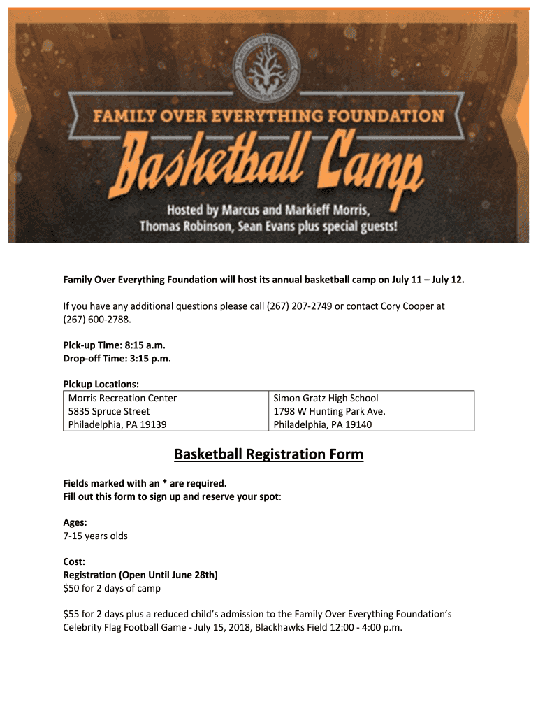 Family Over Everything Foundation will host its annual basketball camp on July 11 July 12. If you have any additional questions please call (267) 2072749 or contact Cory Cooper at(267) 6002788. Pickup