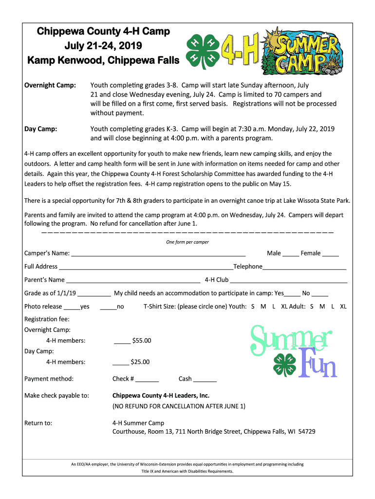 Overnight Camp:Youth completing grades 38. Camp will start late Sunday afternoon, July