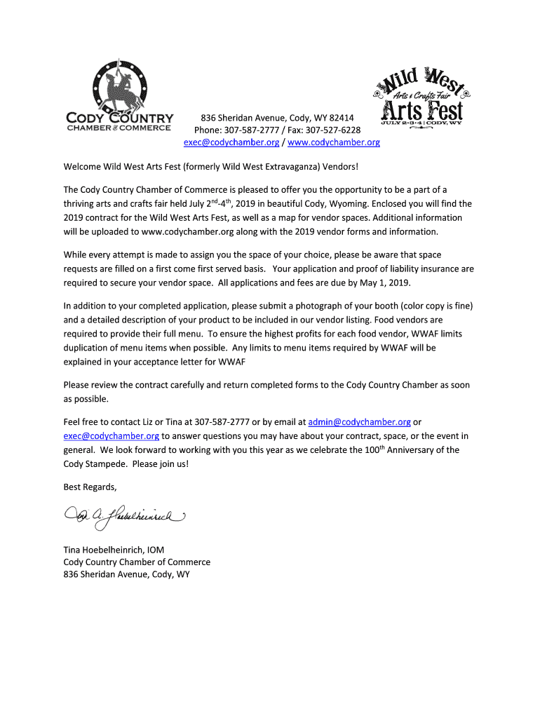 836SheridanAvenue,Cody,WY82414 Phone:3075872777/Fax:3075276228 exec codychamber.org/www.codychamber.org WelcomeWildWestArtsFest(formerlyWildWestExtravaganza)Vendors! TheCodyCountryChamberofCommerceispleasedtoofferyoutheopportunitytobeapartofa