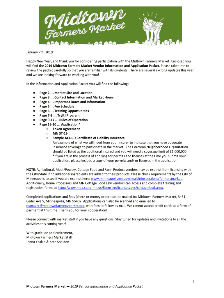 January 7th, 2019 Happy New Year, and thank you for considering participation with the Midtown Farmers Market! Enclosed you will find the 2019 Midtown Farmers Market Vendor Information and Application