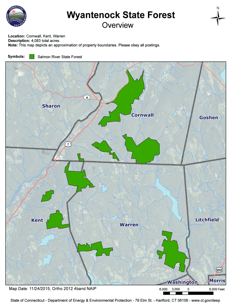 Wyantenock State ForestOverviewLocation: Cornwall, Kent, Warren Description: 4,083 total acres. Note: This map depicts an approximation of property boundaries. Please obey all postings. Symbols:Salmon
