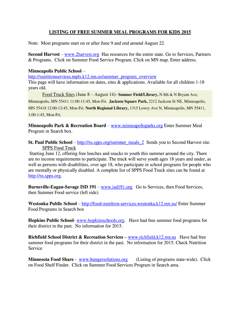 LISTING OF FREE SUMMER MEAL PROGRAMS FOR KIDS 2015 Note: Most programs start on or after June 9 and end around August 22. Second Harvest www.2harvest.org Has resources for the entire state. Go to