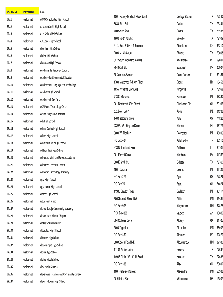 USERNAMEPASSWORDNameBPA1welcome1A&M Consolidated High SchoolBPA2welcome1A. Macro Smith High SchoolBPA3welcome1A. P. Solis Middle SchoolBPA4welcome1A. C. Jones High SchoolBPA5welcome1Aberdeen High