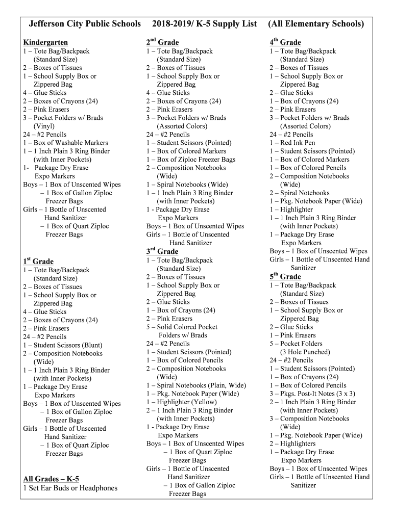 Jefferson City Public Schools20182019/ K5 Supply List(All Elementary Schools)Kindergarten2nd Grade4th Grade1 Tote Bag/Backpack (Standard Size) 2 Boxes of Tissues 1 School Supply Box or Zippered Bag