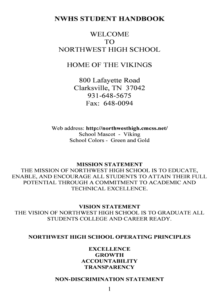 NHS STUDENT HANDBOOK WELCOME TO NORTHWEST HIGH SCHOOL HOME OF THE VIKINGS 800 Lafayette Road Clarksville, TN 37042 9316485675 Fax: 6480094Web address: http://northwesthigh.cmcss.net/ School Mascot