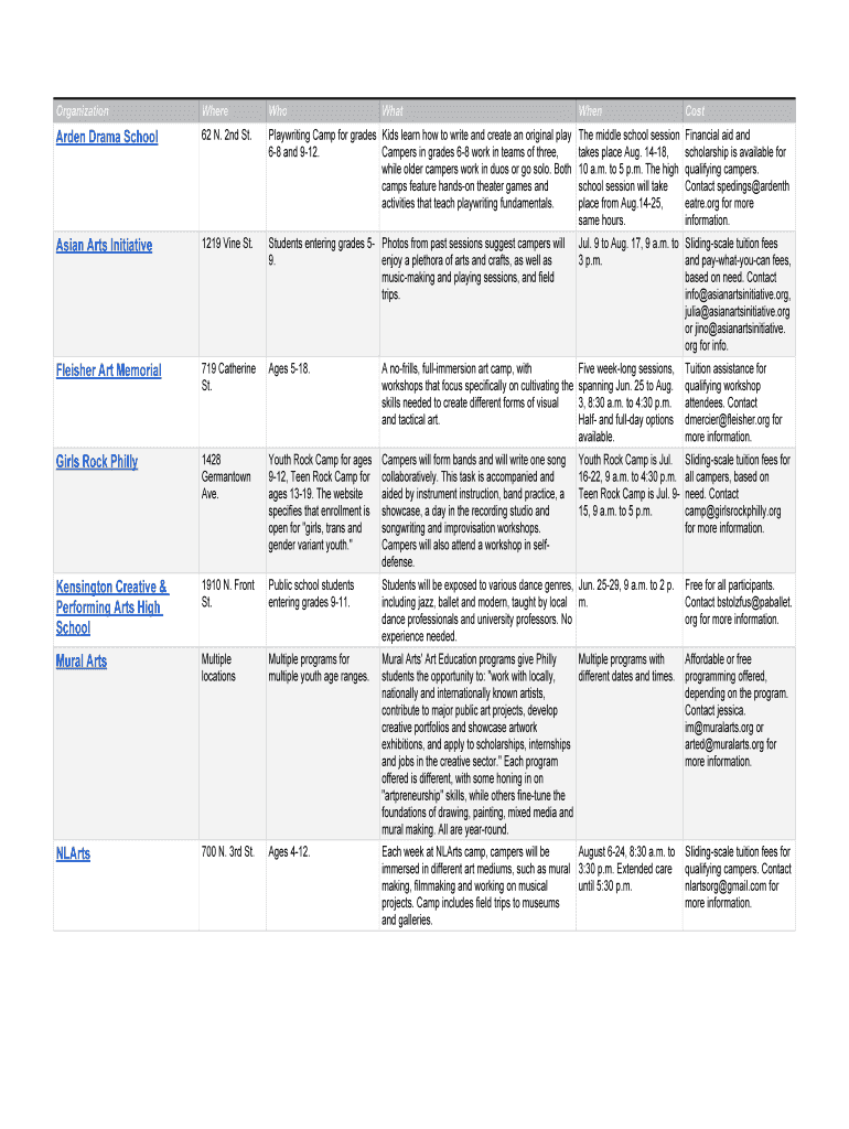 OrganizationWhereWhoWhenCostArden Drama School62 N. 2nd St. Playwriting Camp for grades Kids learn how to write and create an original play