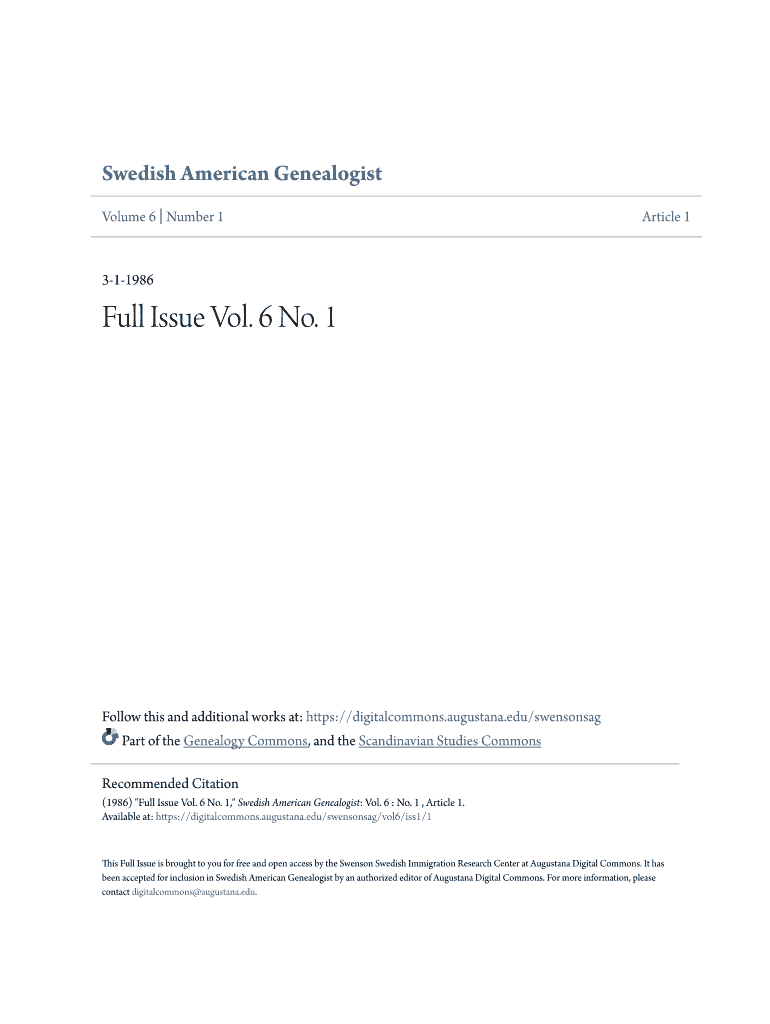 Swedish American Genealogist Volume 6 Number 1Article 1311986Full Issue Vol. 6 No. 1Follow this and additional works at: https://digitalcommons.augustana.edu/swensonsag Part of the Genealogy Commons,