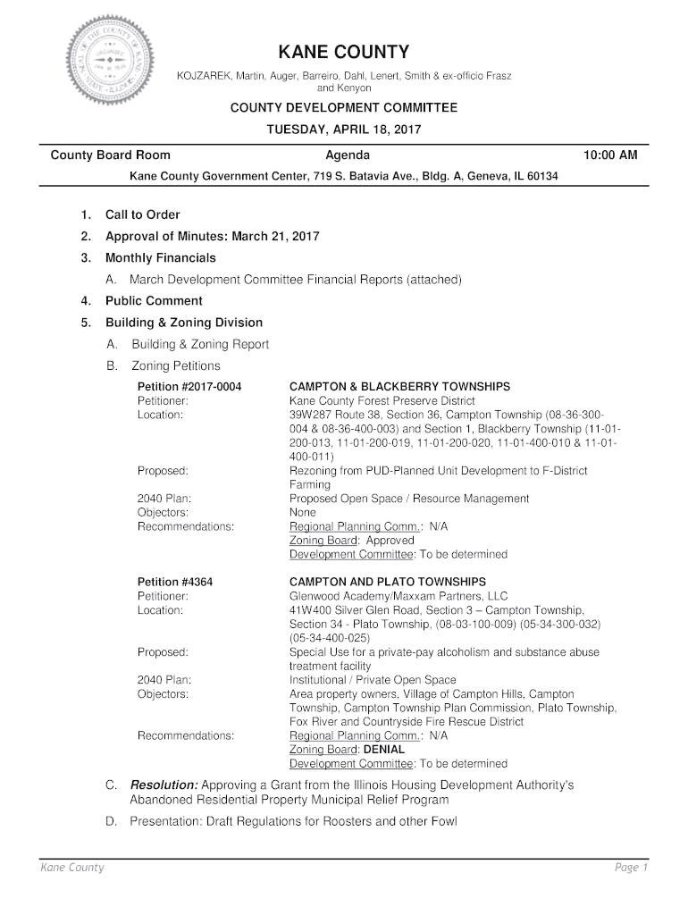 KANE COUNTY OZARK, Martin, Auger, Barbara, Dahl, Desert, Smith & ex-officio Franz and Inyo County DEVELOPMENT COMMITTEE TUESDAY, APRIL 18, 2017, County Board RoomAgenda10:00 AM Kane County Government