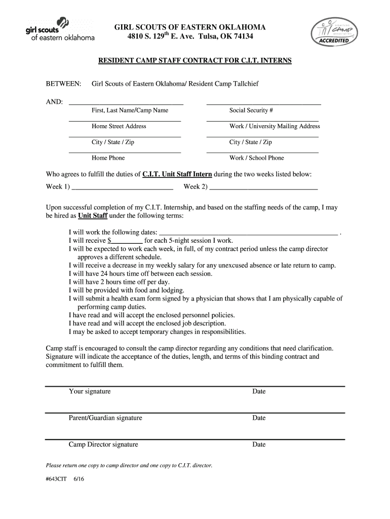 GIRL SCOUTS OF EASTERN OKLAHOMA 4810 S. 129th E. Ave. Tulsa, OK 74134 RESIDENT CAMP STAFF CONTRACT FOR C.I.T. INTERNS BETWEEN:Girl Scouts of Eastern Oklahoma/ Resident Camp Tallchief AND: First, Last